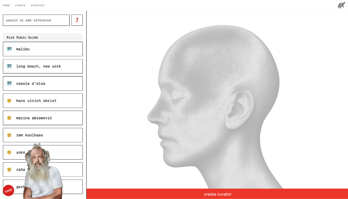 Curate Curator is another experiment. You build a persona. The system gives you four cultural recommendations: one song, one book, one painting, one poem — all on fixed, pre-colored backdrops. Rick Rubin offers guidance and the system prompt references “032c”. You’re not generating “anything.” You’re stepping into an authored lane.
